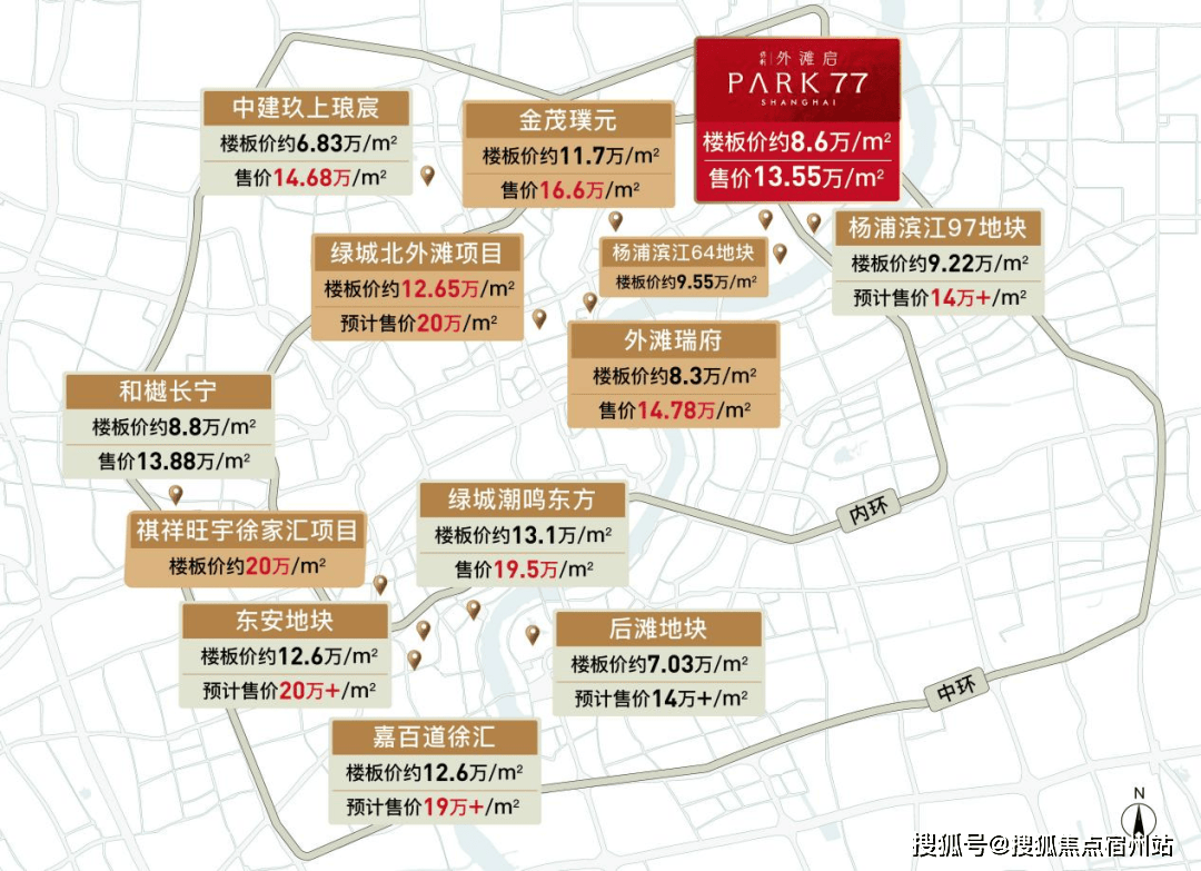 虹口四川北路-临平路14.78-16.6万/㎡,北外滩绿城地王楼板价约13.6万/㎡,这一楼板价,几乎与保利外滩启PARK77均价13.55万/㎡持平,未来该地块也将剑指20万/㎡。