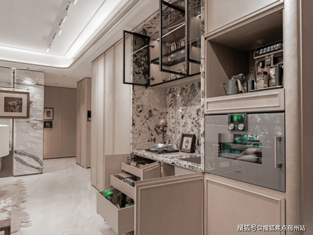 当下在顶豪里流行的弧形元素,项目也全部采用,幻日流光岩板、柳叶拼/鱼骨拼地板、踢脚线、吊顶等,“弧线拉满”,势必要给业主顶豪的居住体验:
